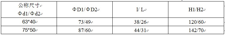 其中“ΦD1”表示管件主管口公称外径,“Φd1”表示管件主管口公称内径,“ΦD2”表示管件支管口公称外径,“Φd2”表示管件支管口公称内径,“L”管件主管口承插长度,“l”表示管件支管口承插长度,“H1”管件长度,“H2”表示管件中心距,1.0MPa=10公斤