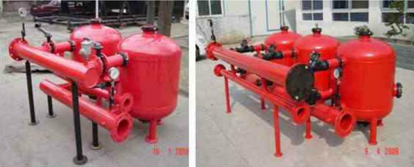 砂石过滤器是一种在灌溉上使用较为普遍的初级过滤器。主要应用于灌溉用地表水源(水库、塘坝、沟渠、河湖及其它开放水源)的初级过滤,可分离水中的水藻、漂浮物、有机杂质。