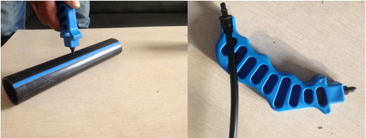 1. 将打孔器钉头垂直于PE管,手紧握住打孔器柄,下压。